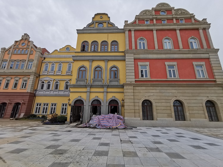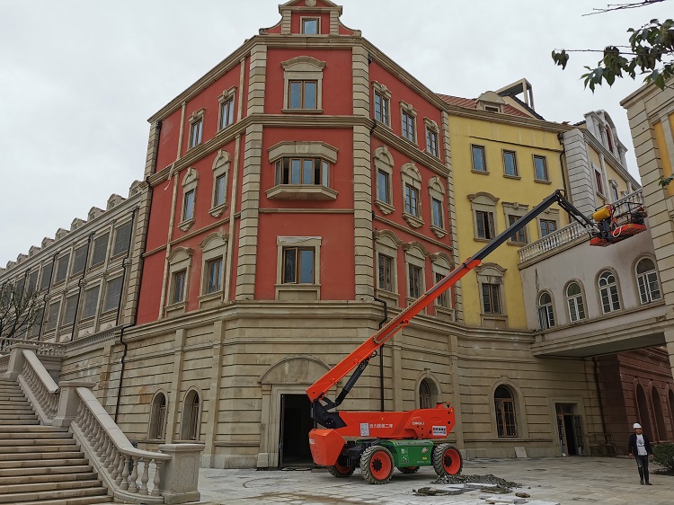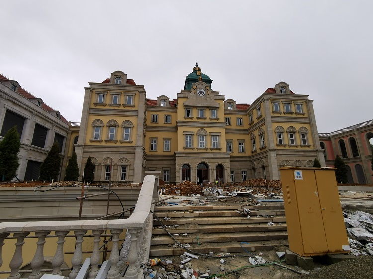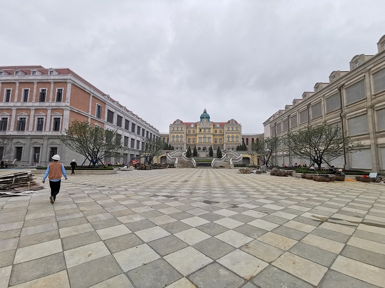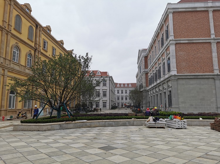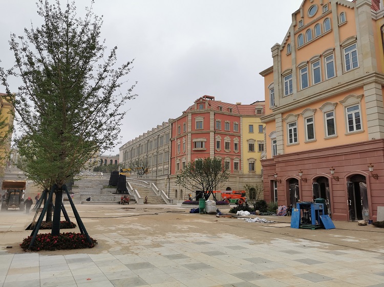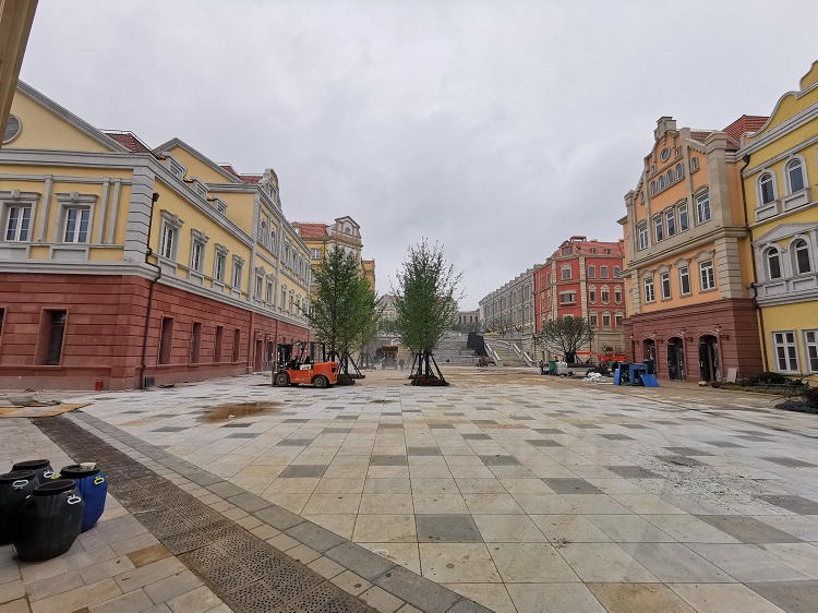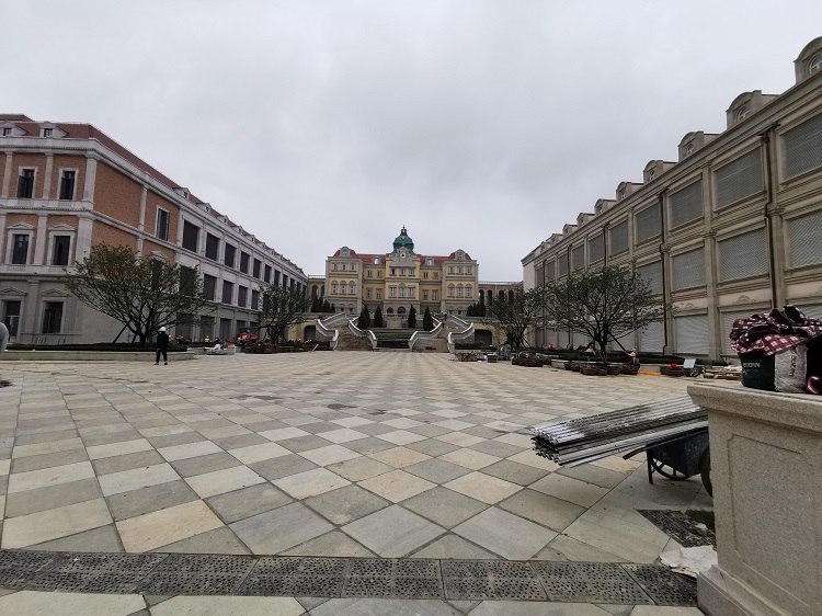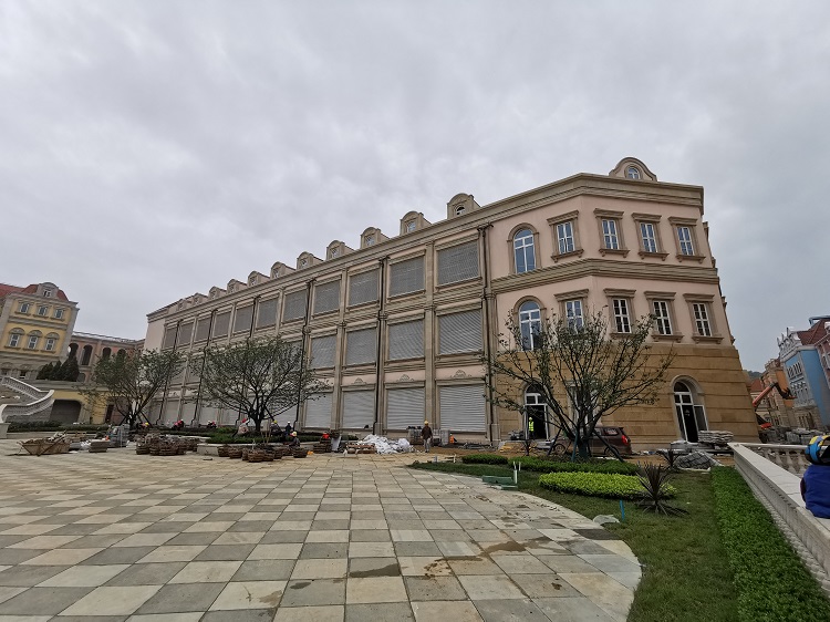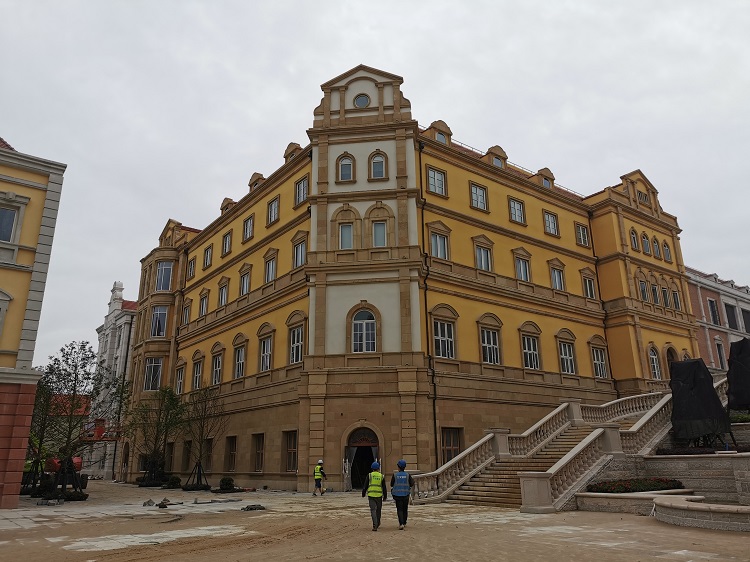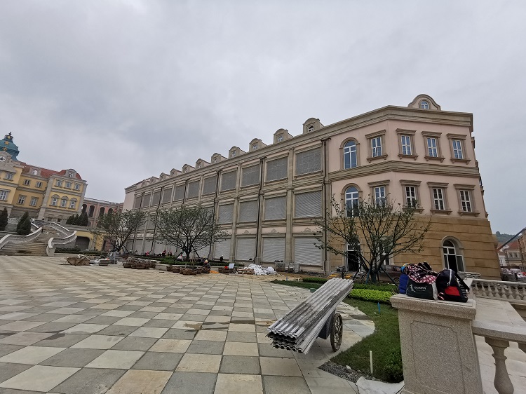 使用材料:米黃砂巖平板3cm厚約10000平方米 ,3-25cm厚異形線條約:·5000米;圓柱、方柱、花瓶柱約:2000根?