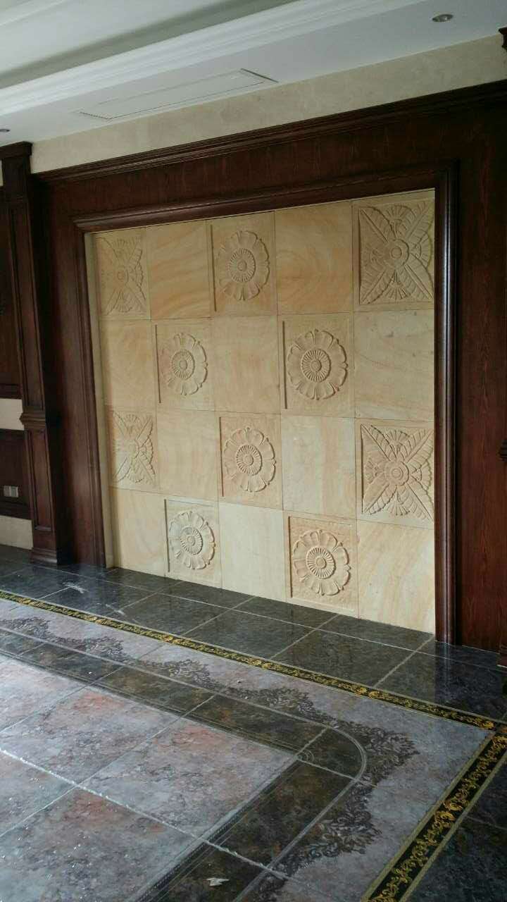 ??? 四川自貢龍湖郡別墅#棟#號(hào)電視墻,采用黃木紋砂巖拼花雕刻。黃木紋砂巖紋理有直紋、山水紋,做雕刻是最好的選材。