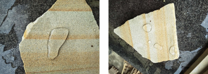 【聽(tīng)】即聽(tīng)砂巖的敲擊聲音。一般而言,質(zhì)量好的砂巖其敲擊聲相對(duì)清脆悅耳;若砂巖內(nèi)部存在某輕微裂隙或因風(fēng)化導(dǎo)致顆粒間接觸變松,敲擊聲就會(huì)相對(duì)粗啞。