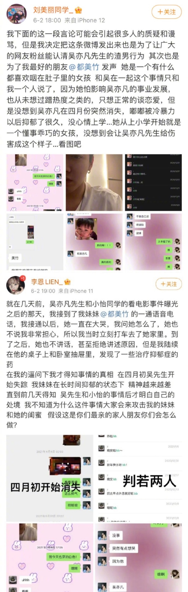 事情還要從兩個月前說起,在6月2日,本次事件的女主角在微博上登場,一位id名叫劉美麗同學控訴吳亦凡對待都美竹的冷暴力行為,對都美竹造成了嚴重的心理傷害,并因此而患上抑郁癥,當時正在服用治療抑郁癥的藥物。