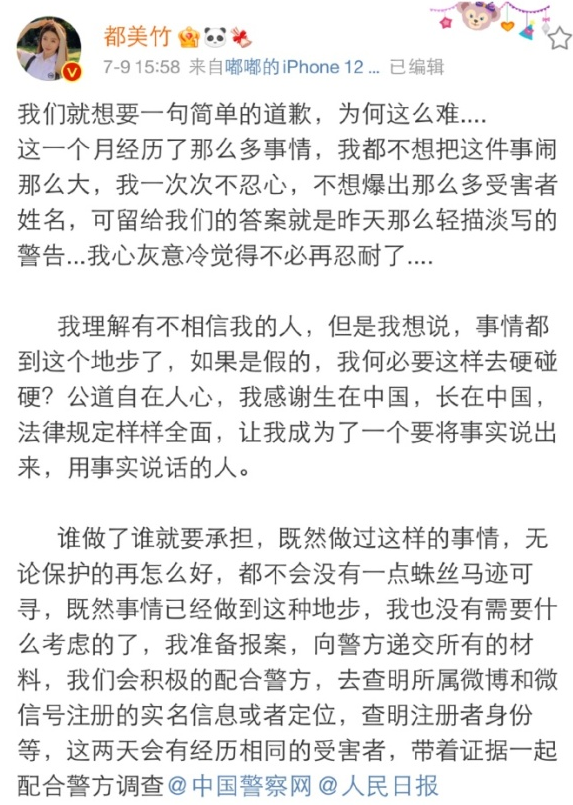 隨后在長達半個月的時間里,都美竹微博爆料不斷,并稱掌握了多份證人證詞,言談間充滿自信,意思就是“吳亦凡,只要我愿意,我立馬就能讓你進監(jiān)獄”。隨后在7月9日表示準備報案,讓法律來解決這個人渣。
