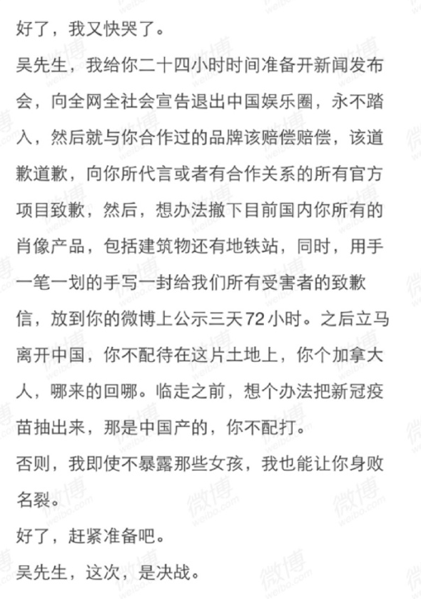 7月18日,有一個重磅炸彈來襲,都美竹再次放出微博,微博文案水平劇增,金句頻出,既有“我的很大,你忍一下”這樣膾炙人口的“名言”,文風也絲毫不拖泥帶水,清晰地陳列了吳亦凡的罪狀,這樣的文案,很難想象出自一個剛剛成年的女孩之手。任何一個對吳亦凡無感的人,在看過此篇微博后,對吳亦凡的憤慨之情,油然而生。
