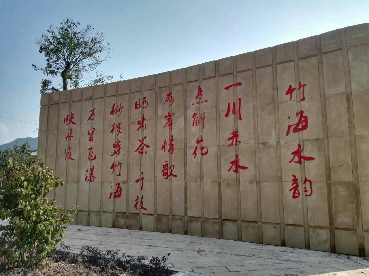 四川匯豐砂巖赤水工地黃木紋刻字板安裝效果圖。